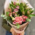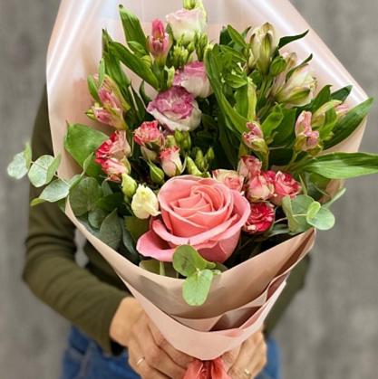 Букет из альстромерий, лизиантусов, кустовых и одиночных роз с добавлением эвкалипта в стильной упаковке